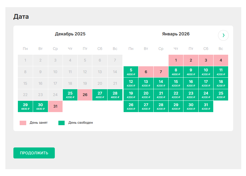 空闲日期通常用绿色高亮或白色背景显示